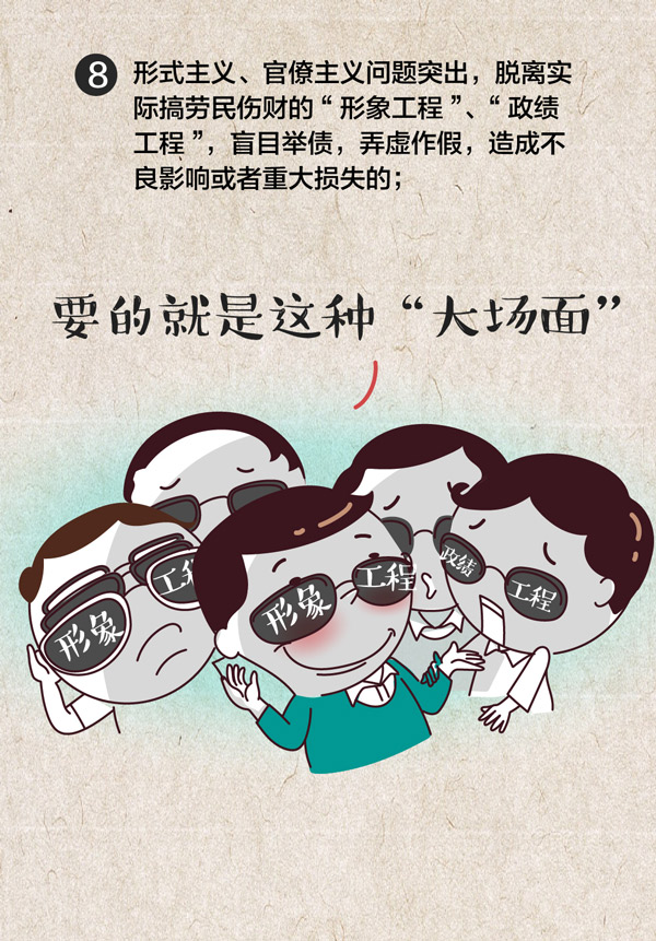 ?。ò耍┬问街饕?、官僚主义问题突出,脱离实际搞劳民伤财的“形象工程”、“政绩工程”,盲目举债,弄虚作假,造成不良影响或者重大损失的;